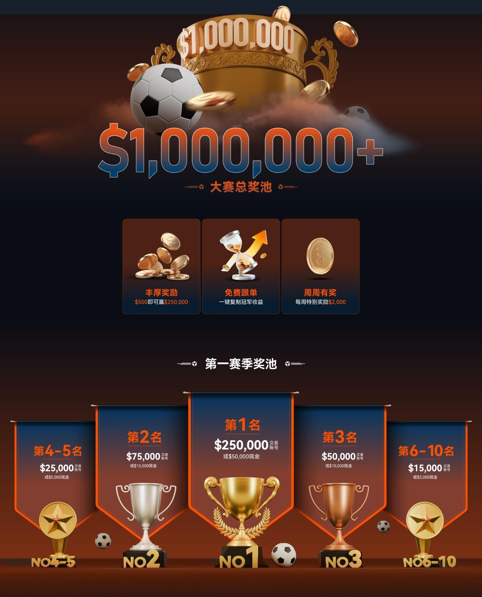 這里不是簡單的數(shù)字博弈,而是一場關于策略、膽識與榮耀的終極對決。在這片瞬息萬變的金融賽場上,策略是戰(zhàn)術體系,風控是防守陣型,而每一次精準的交易,都是決定勝負的關鍵一擊。全球頂尖交易精英將在統(tǒng)一規(guī)則下同場競技,以實力爭奪榮耀,在K線綠茵場上共同角逐雙賽季超$1,000,000的總獎池。